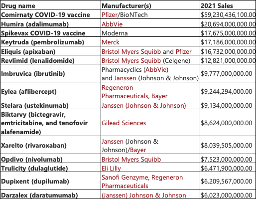 The drugs on the 2021 best-seller list encompass inflammatory therapies, cardiovascular drugs, COVID treatments, cancer drugs, drugs for other infectious disease such as HIV cocktails, diabetes treatments, and eye-degeneration therapies which millions of elderly Americans rely on, among others. This shouldn’t be much of a surprise given the level of disease and death linked to heart conditions, cancer, metabolic disorders, and inflammatory conditions.